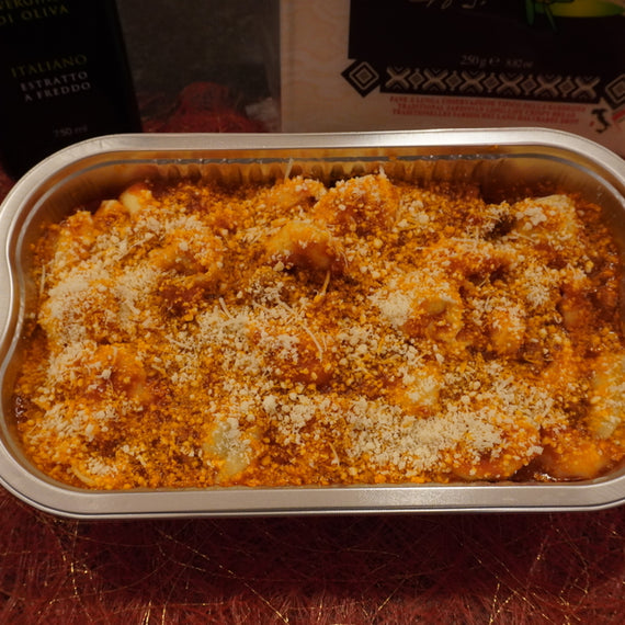 Ingrédients: cappelletti (farine de blé, semoule, oeufs, viande de boeuf, viande de porc, mix de légumes, parmesan, chapelure, noix de muscade, sel, poivre), sauce bolognese (huile de tournesol, viande de boeuf, viande de porc, sel, poivre, mix de légumes, vin rouge), béchamel, parmesan