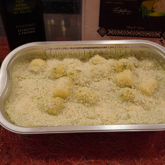 Ingrédients: gnocchi (farine de blé, pommes de terre, oeufs, sel, lait écrémé), sauce crème, pesto genovese, parmesan