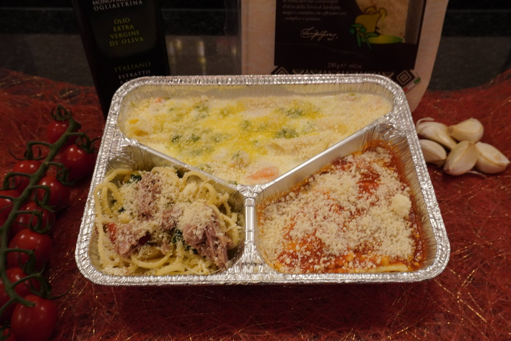 Ingrédients: variation de pâtes maison végétarienne (linguine légumes et thon, penne presto crevettes, ravioli sorrentina), parmesan